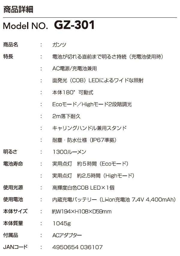 【充放電 約500回消費電力】:10W点灯時間】:約5時間(Ecoモード)/ 2.5時間(Highモード)
